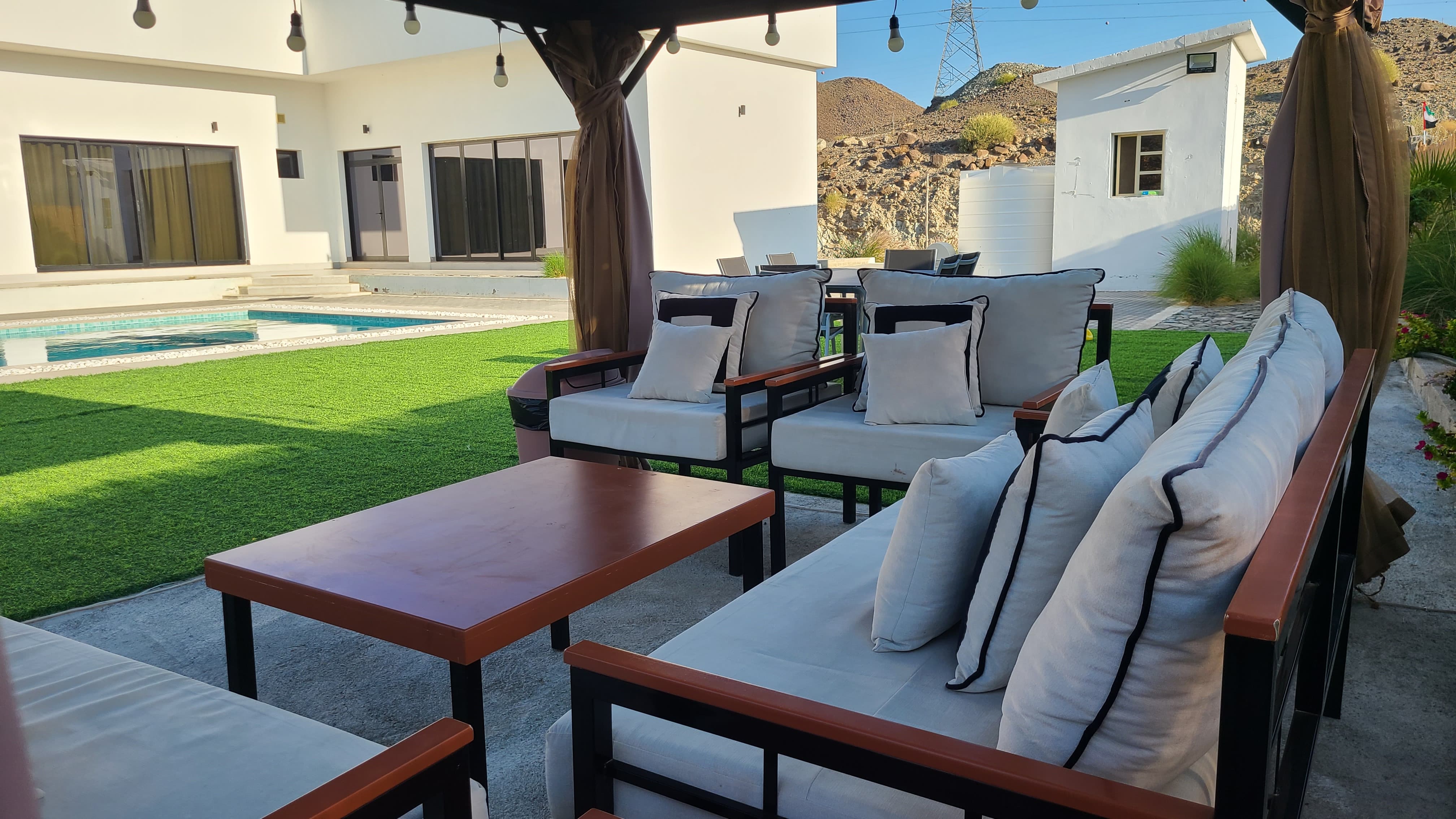 The Majlis & Seating: A separate outdoor Majlis featuring its own bathroom and toilet provides a traditional and private space for gatherings, alongside multiple outdoor seating areas designed for sunset viewing.